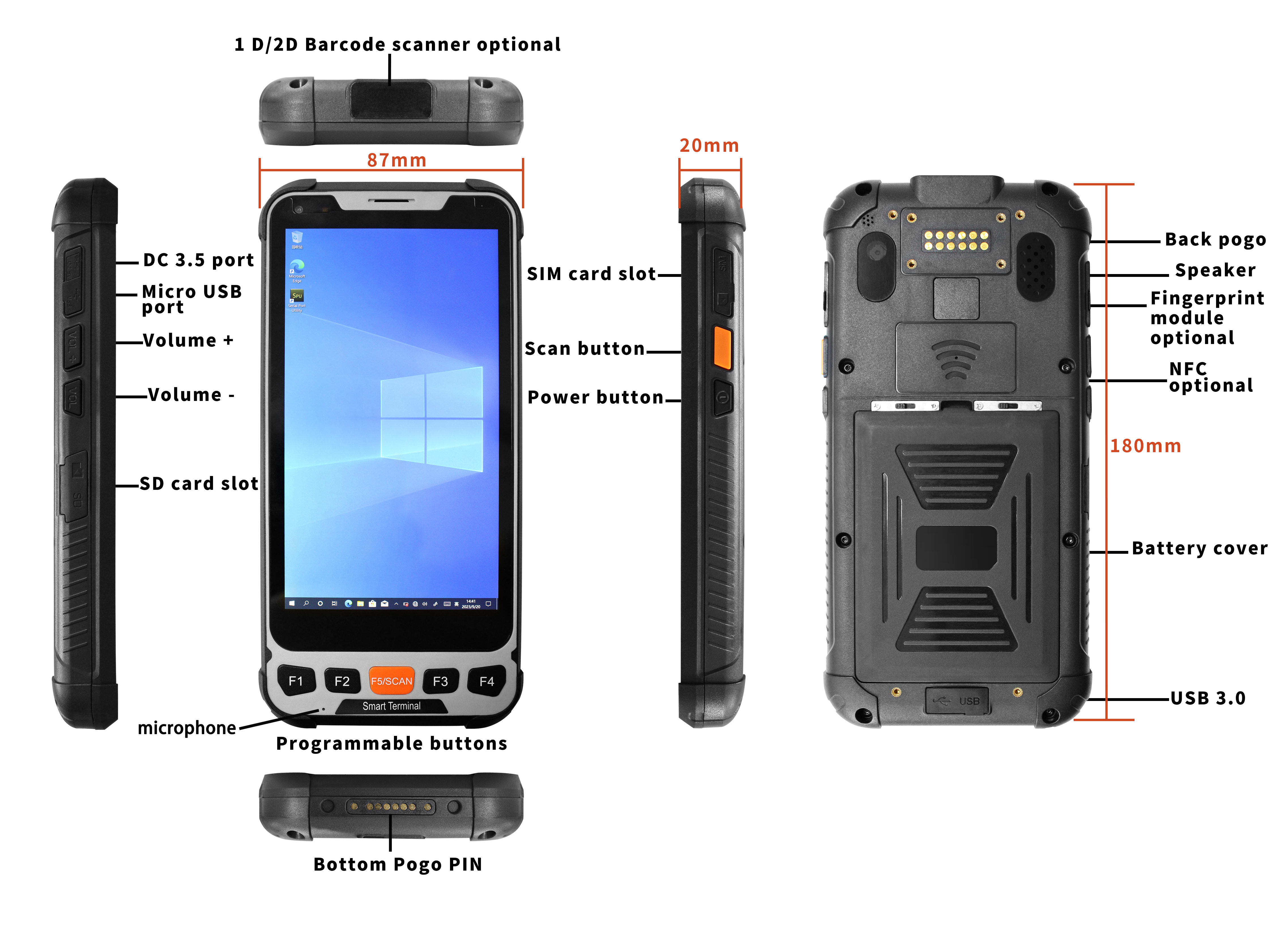 SH5-W是一款5.5英寸堅固耐用的手持終端,由英特爾Cherry Trail Z8350四核處理器(1.44GHz,渦輪高達1.92GHz)供電,運行Windows 10 Pro(家庭/物聯網可選)。它具有4GB/64GB存儲、5.5英寸1080×1920 IPS顯示屏(400nits)、2MP前置/5MP後置攝像頭、5000mAh 3.8V電池(19.0Wh)、4G LTE連接(EG91-EX/NAX模塊)、英特爾WiFi 6 3165和藍牙4.2。它具有IP65防塵/防水、1.2m跌落、可選UHF RFID(5M範圍)和指紋傳感器