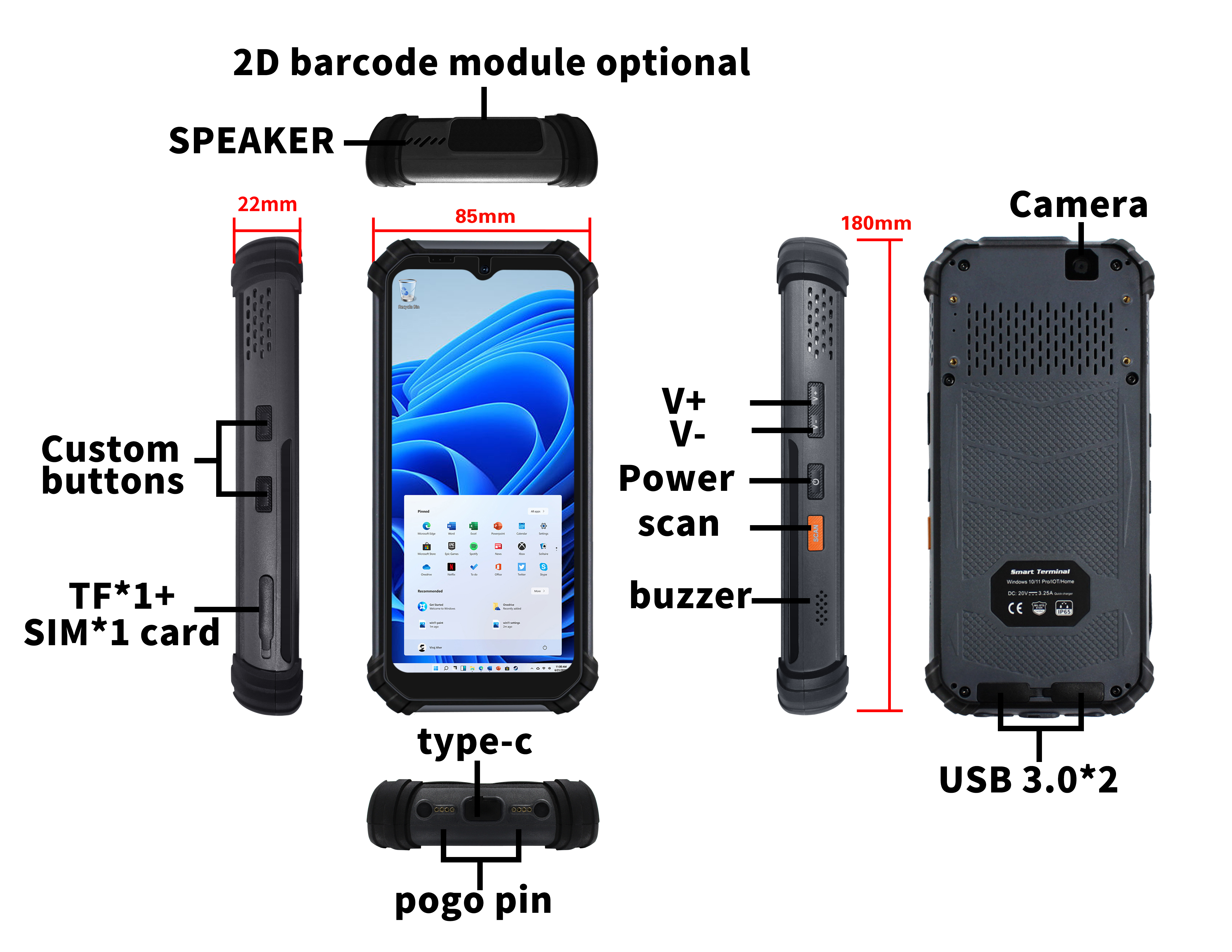 Type-C×1(全功能;20W 快充);SIM 卡槽×1;TF 卡槽×1;USB 3.0×2 底部 8PIN 彈簧針介面 |