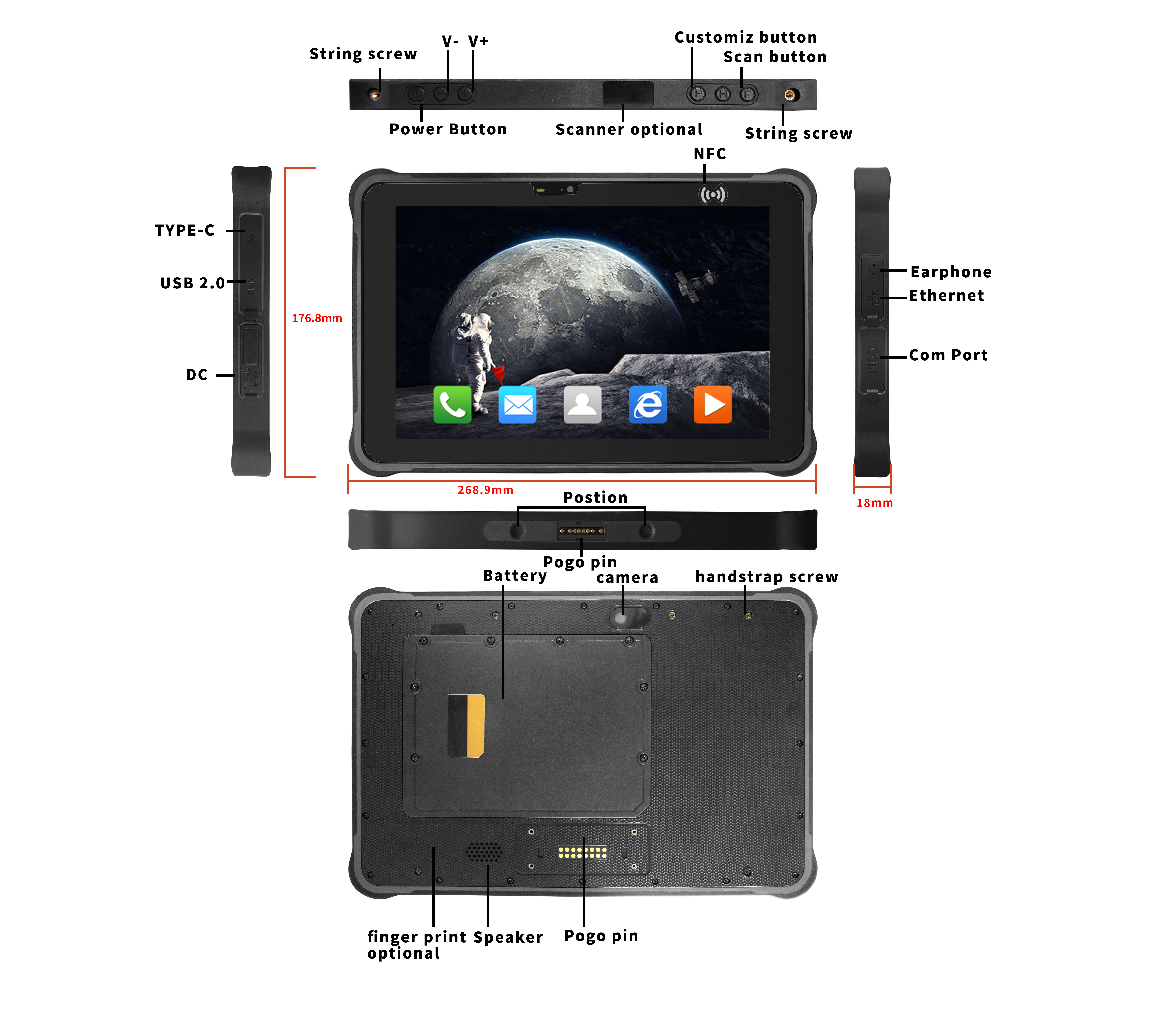 Type-C ×1(支援OTG);SIM卡插槽×1;TF卡插槽×1;耳機孔×1;DC電源孔×1(3.5×12mm);USB 2.0×1;RJ45網孔×1;RS232串列埠×1 底部彈針:USB 2.0、充電、RS232 背部彈針:USB 2.0、RS232 |