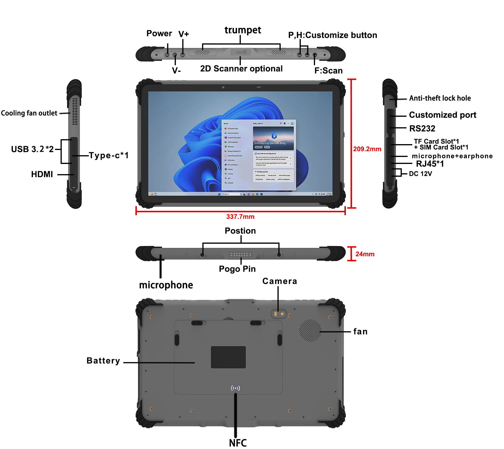 HDMI Type A×1;USB3.2×2;Type-C×1(支援快速充電);防盜鎖孔;航空介面×2(可客製化&RS232,僅支援RS232的TX RX GND);卡插槽(SIM+TF);耳機孔(∮3.5公厘);乙太網路埠RJ45(10/100/1000兆);直流電源介面(∮4.0公厘) 底部彈簧針(pogopin):USB 2.0;充電;RS232 |