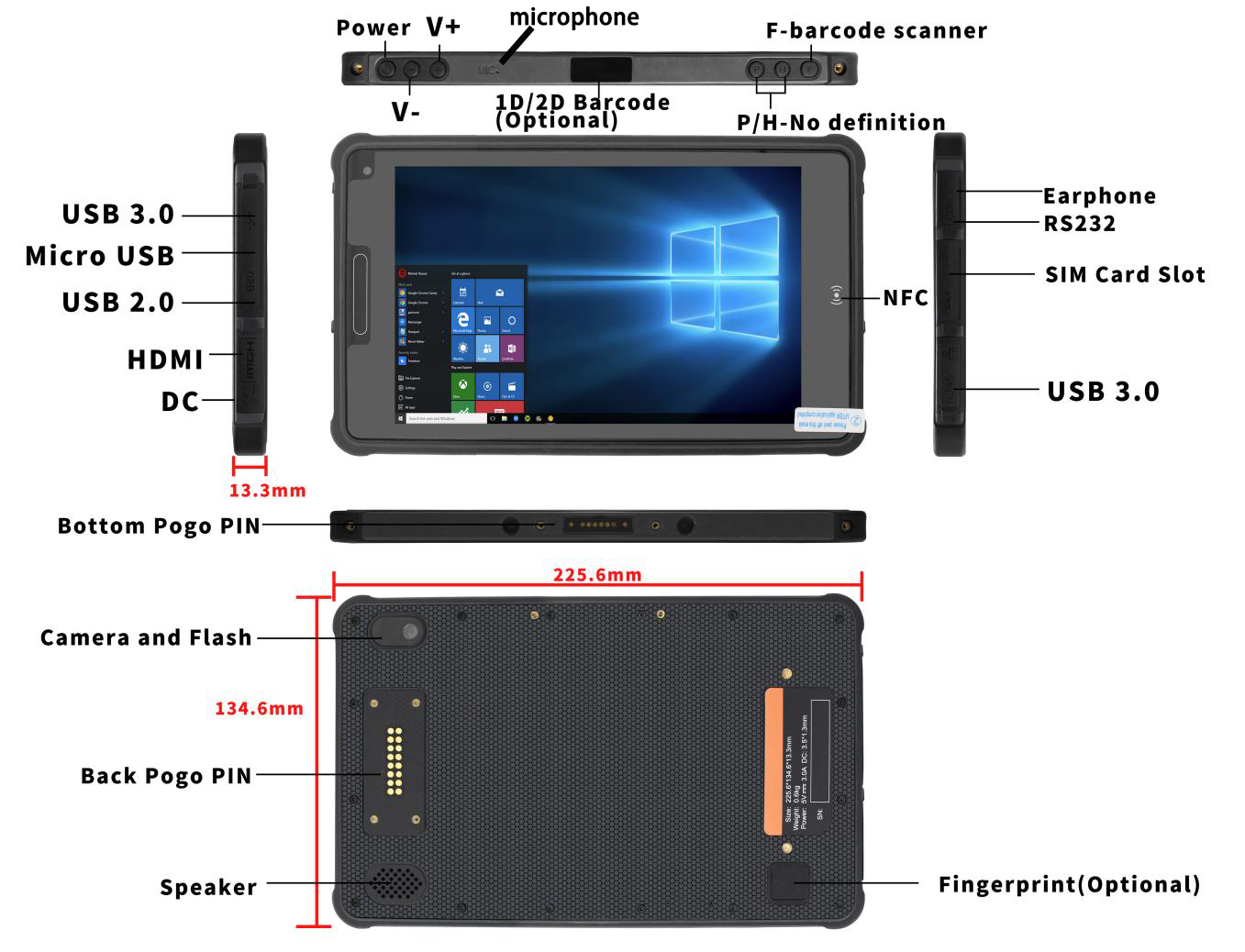 | 輸入/輸出介面 (Interface In/Out Port) | HDMI×1、SIM卡插槽×1、RS232×1(mini-USB介面)、耳機孔×1、直流電源孔×1(3.5×12mm)、USB-A:USB 3.0×2 + USB 2.0×1 底部彈簧針:USB 2.0、充電、RS232 背部彈簧針:USB 2.0、RS232 |