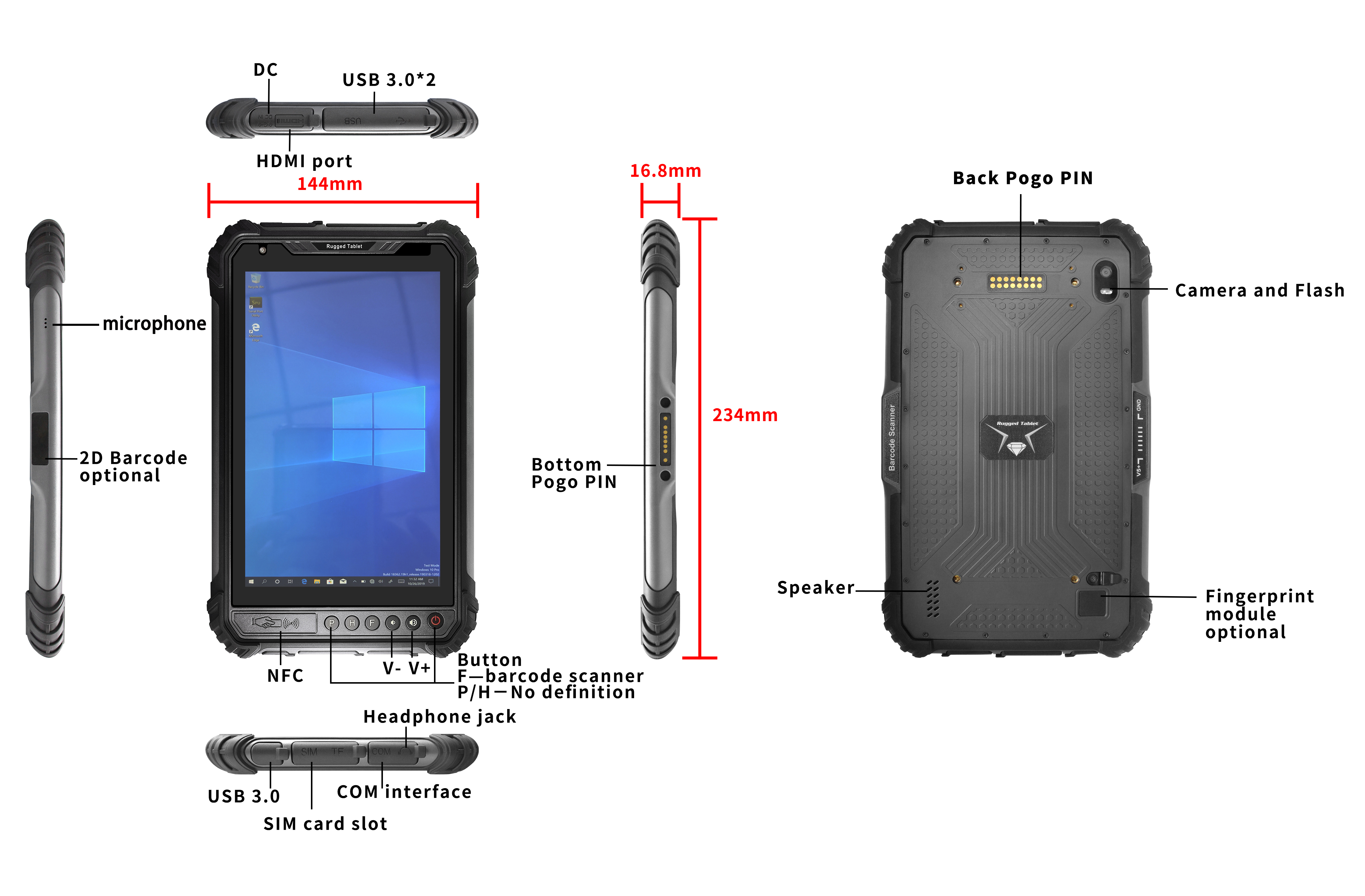 HDMI*1、SIM 卡插槽*1、RS232*1(mini-USB 介面)、耳機孔*1、直流電源接口(DC)*1(規格 4.0*15mm)、USB 3.0 *3 底部彈片接口(pogopin):支援 USB 2.0、充電功能、RS232 通訊 背部彈片接口(pogopin):支援 USB 2.0、RS232 通訊 |