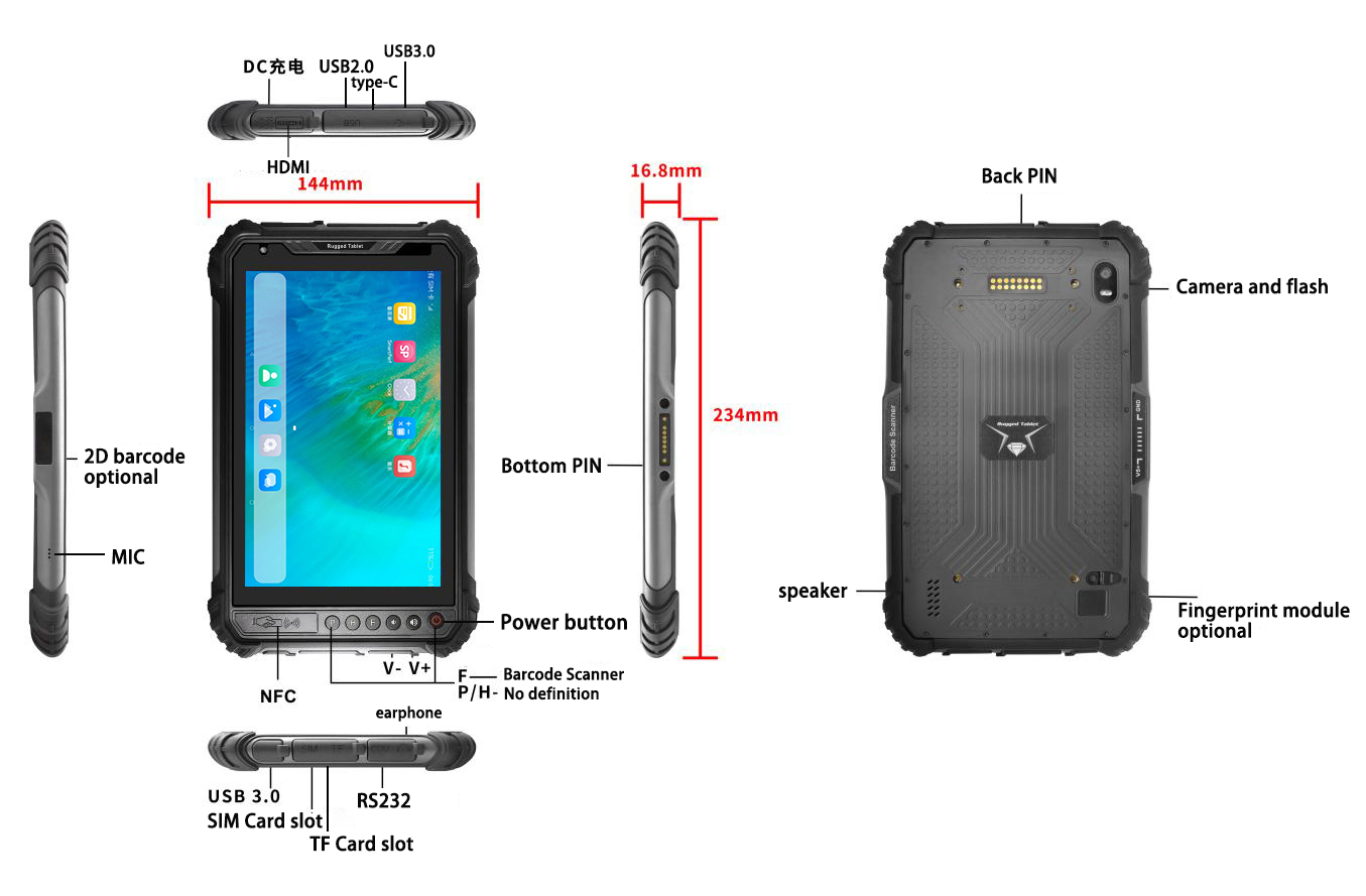 | 輸入/輸出接口 | Type-C *1(OTG/快充)、SIM卡插槽*1、TF卡插槽*1、耳機接口*1、直流電源接口*1(4.0*15mm)、USB 2.0 *1、USB 3.0 *2、RS232*1(mini-USB接口)、HDMI*1 底部彈針接口:USB 2.0;充電;RS232 背部彈針接口:USB 2.0;RS232 |