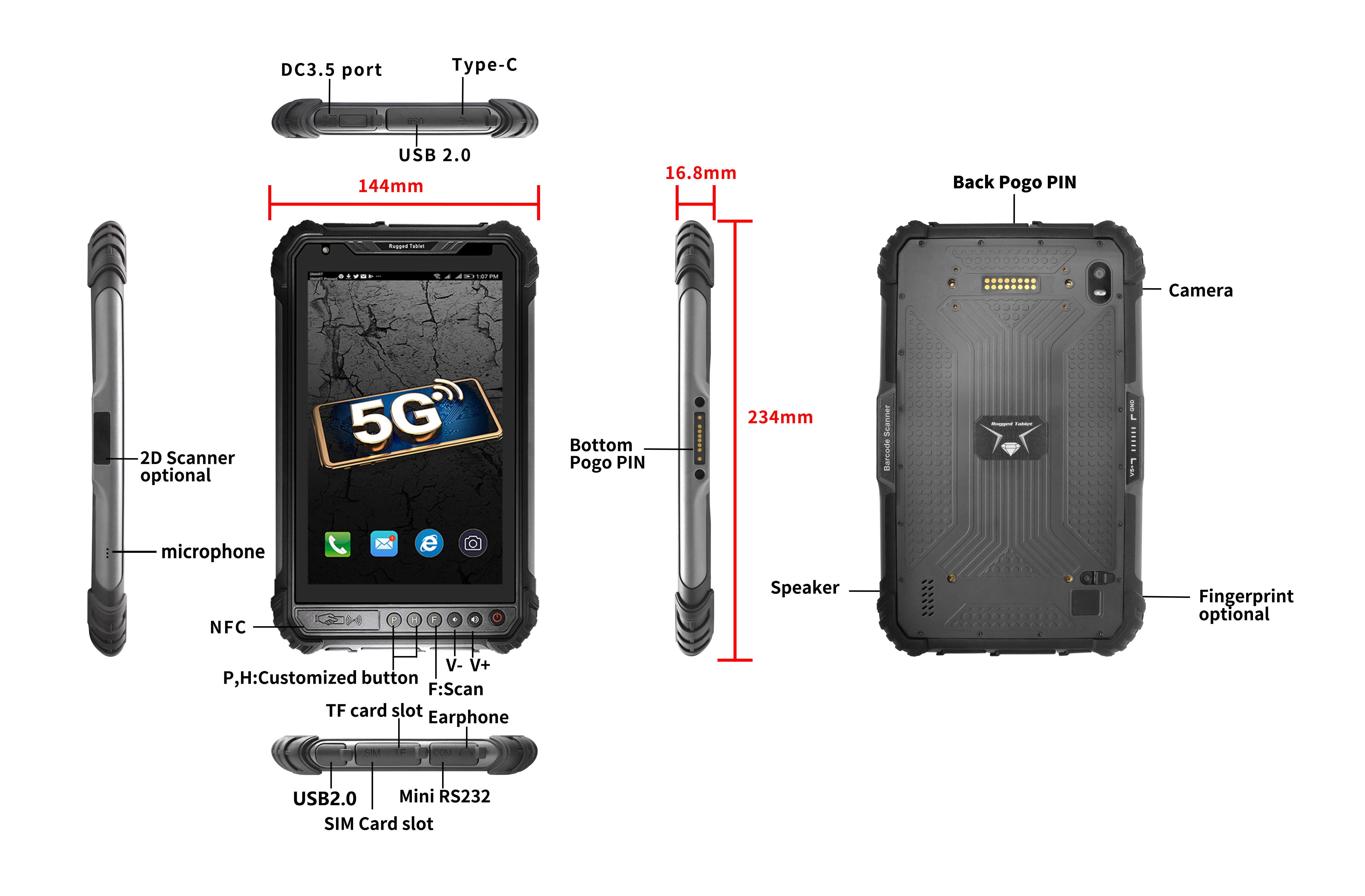 Type-C ×1(支援OTG)、SIM卡插槽×1、TF卡插槽×1、耳機孔×1、DC電源孔×1(3.5×15公厘)、USB 2.0 ×2、RS232介面×1(迷你USB) 底部彈針介面:USB 2.0;充電;RS232 背部彈針介面:USB 2.0;RS232 |