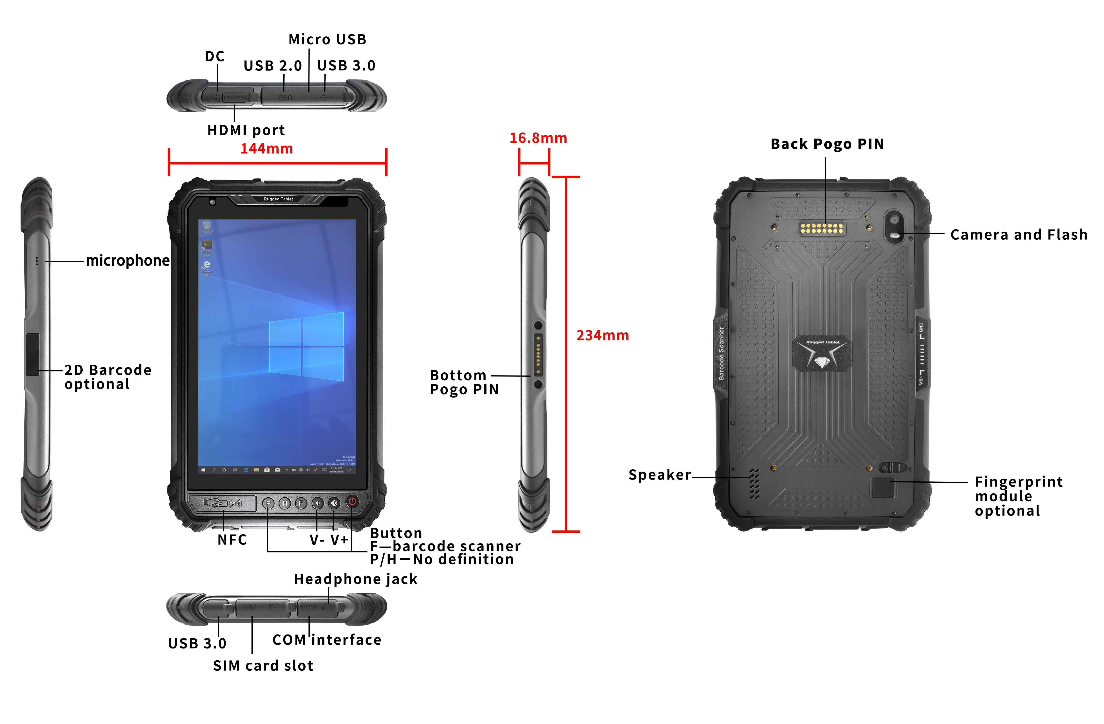 HDMI×1、SIM卡插槽×1、RS232介面×1(迷你USB)、耳機孔×1、DC電源孔×1(3.5×15公厘)、USB-A介面:USB 3.0×2 + USB 2.0×1 底部彈針介面:USB 2.0;充電;RS232 背部彈針介面:USB 2.0;RS232 |